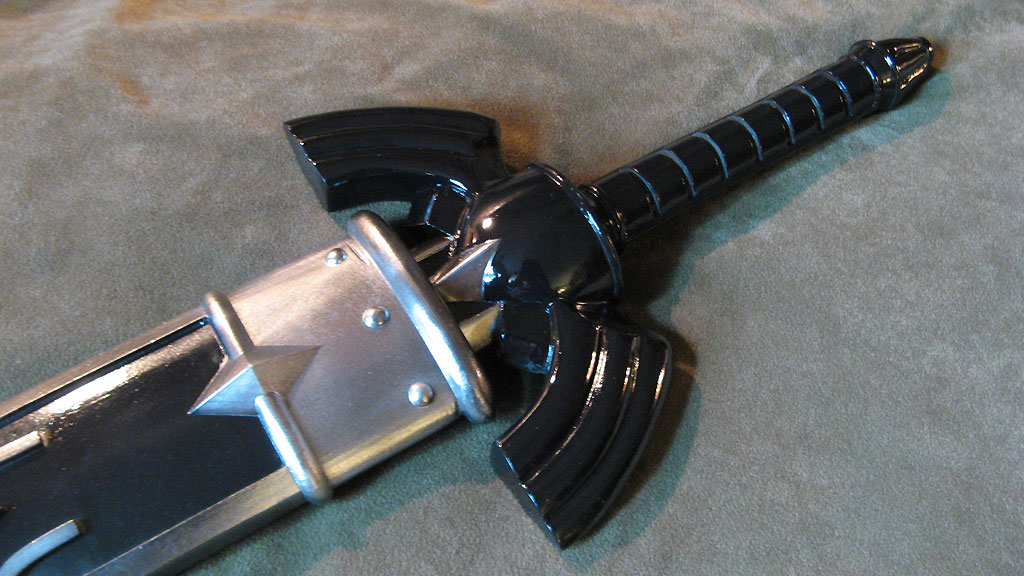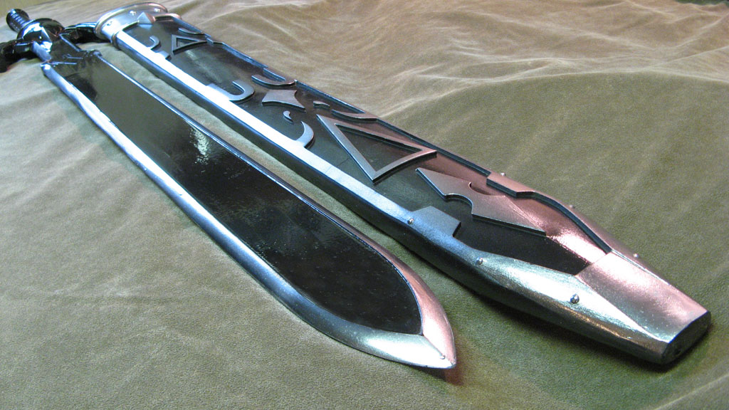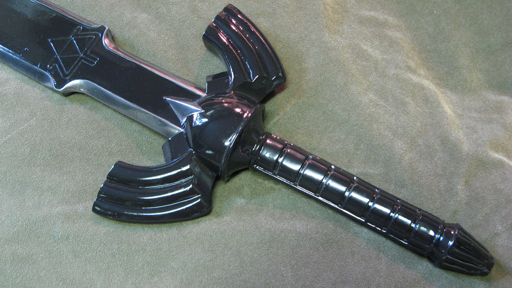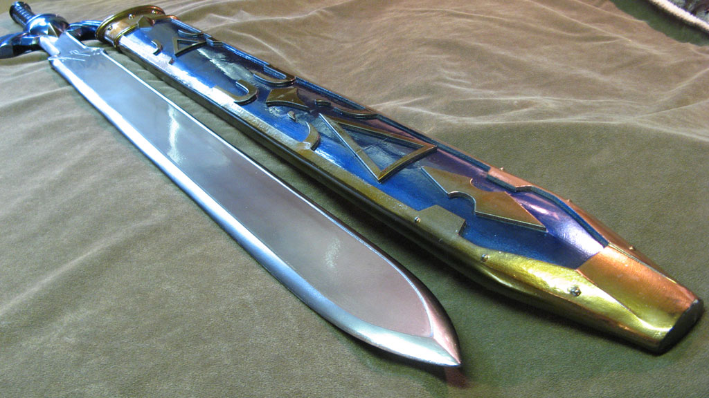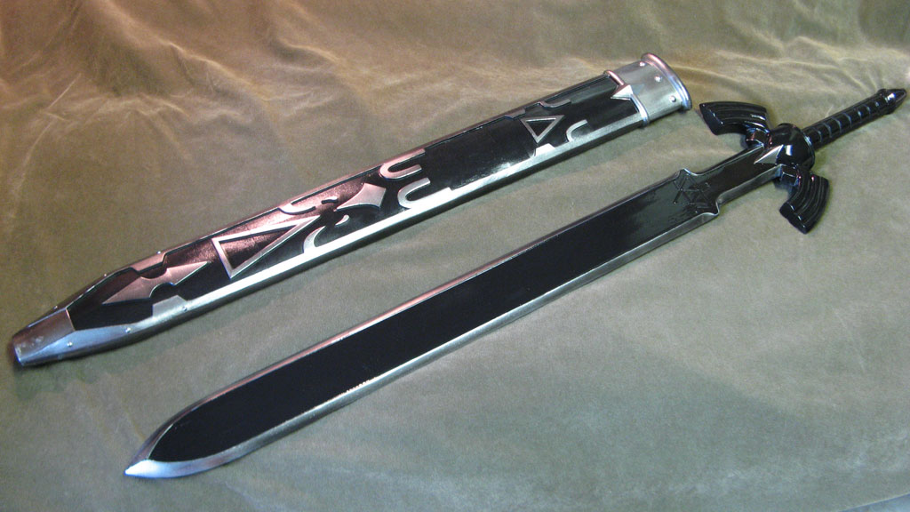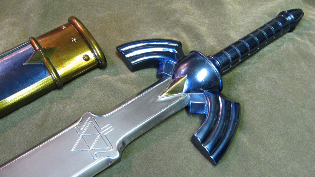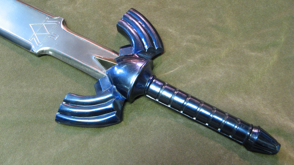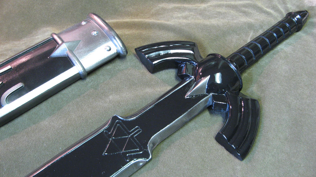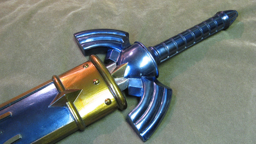 This replica of Link’s Master Sword from Zelda: Ocarina of Time is probably the most accurate cosplay safe collector prop out there. I spent a great deal of time making it myself, paying careful attention to every tiny detail, and sizing overall proportions to the concept art. The sword and sheath are in pristine condition, with a polish smooth surface down to 400 grit sandpaper, and finished with chrome paint. It is NOT STEEL though, and can chip if abused. This is for costuming only, not combat. It is made with solid resin and reinforced with aluminum rods for structural support. The blade is light enough for carrying as a cosplay weapon, and convention safe for carrying around in costume, or just great for showcasing on your wall. The paint was custom automotive paint for a metallic and mirror-like shine. The sword measures about 42" long, and weighs about 3 lbs. The sheath holds the blade firmly in place, and won’t fall out if shaken around.