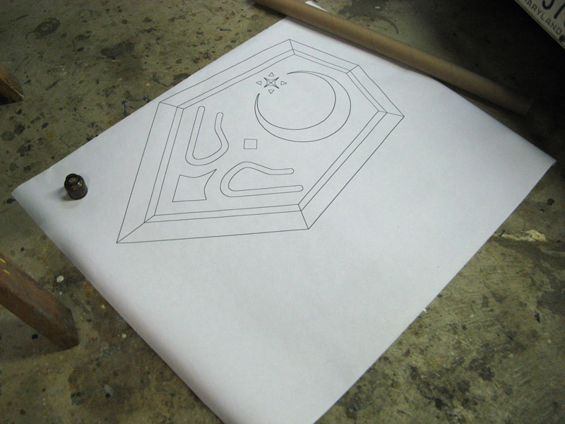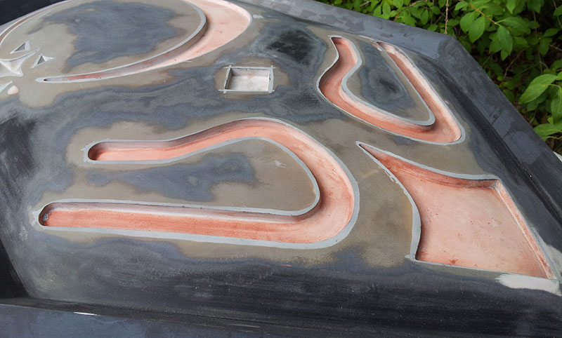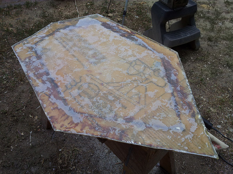 Most of the fiberglassing has been done at this point. The smooth coat has been applied to give a nice even, semi-level surface to the front. The back was fiberglassed and roughly sanded. Then hardboard pieces were cut out, the edges were beveled, and then glued onto the back of the shield for the final look.