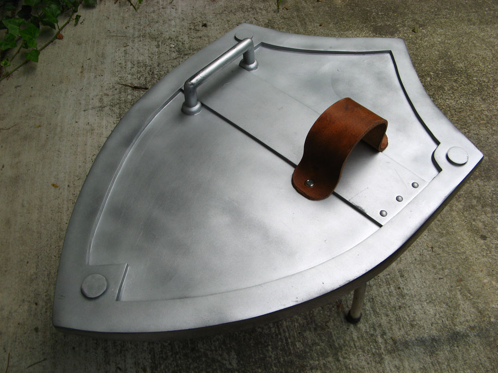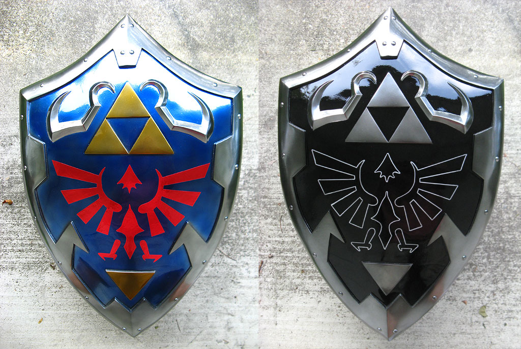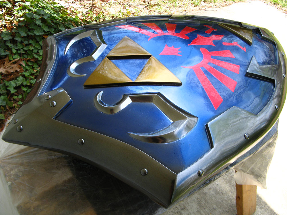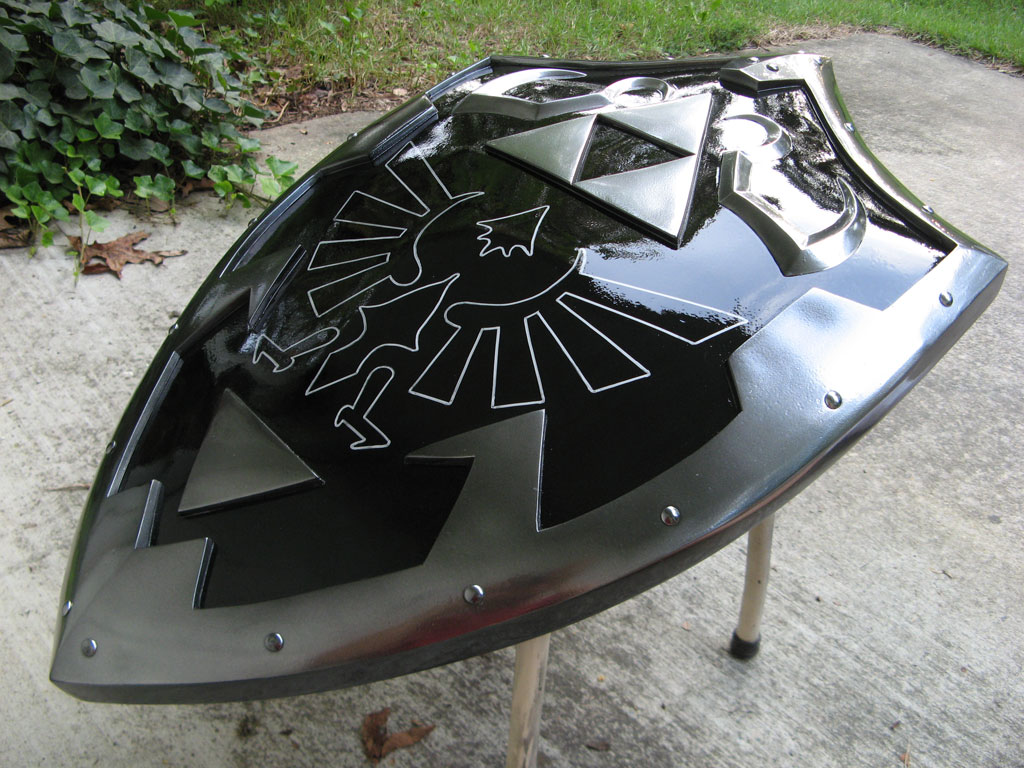 This is Link’s Hylian Shield from Zelda: Ocarina of Time. The surface of the shield was made of very strong resin to resist light impacts, while the inside was filled with foam to keep the weight down during cosplay. The shield measures a 29” x 19” inch surface area, and has an overall weight of about 5 lbs. The automotive paint gives a reflective chrome shine to the prop, and creates the appearance of a steel replica. The back is also adorned with a sturdy handle and leather arm strap for wielding right handed.